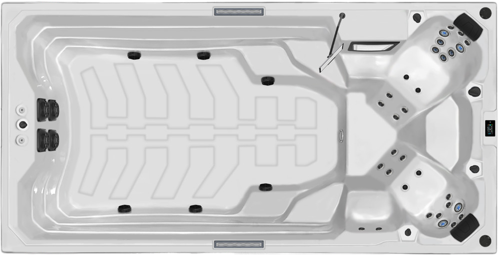 - Двойная гидросистема: 31 массажная форсунка и 2 мощных насоса противотока (2,2 кВт) обеспечивают одновременно нежный массаж и профессиональные условия для плавания
