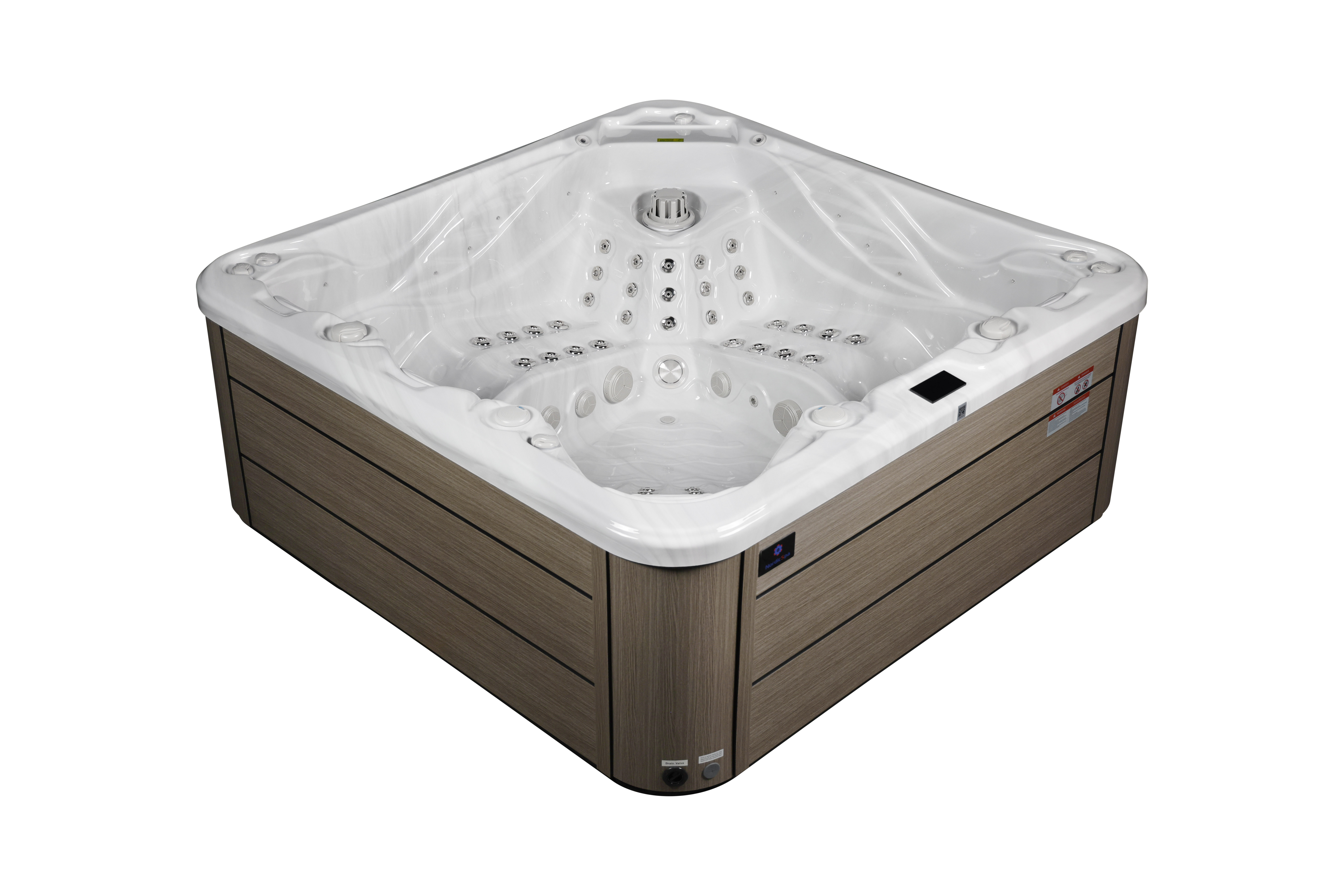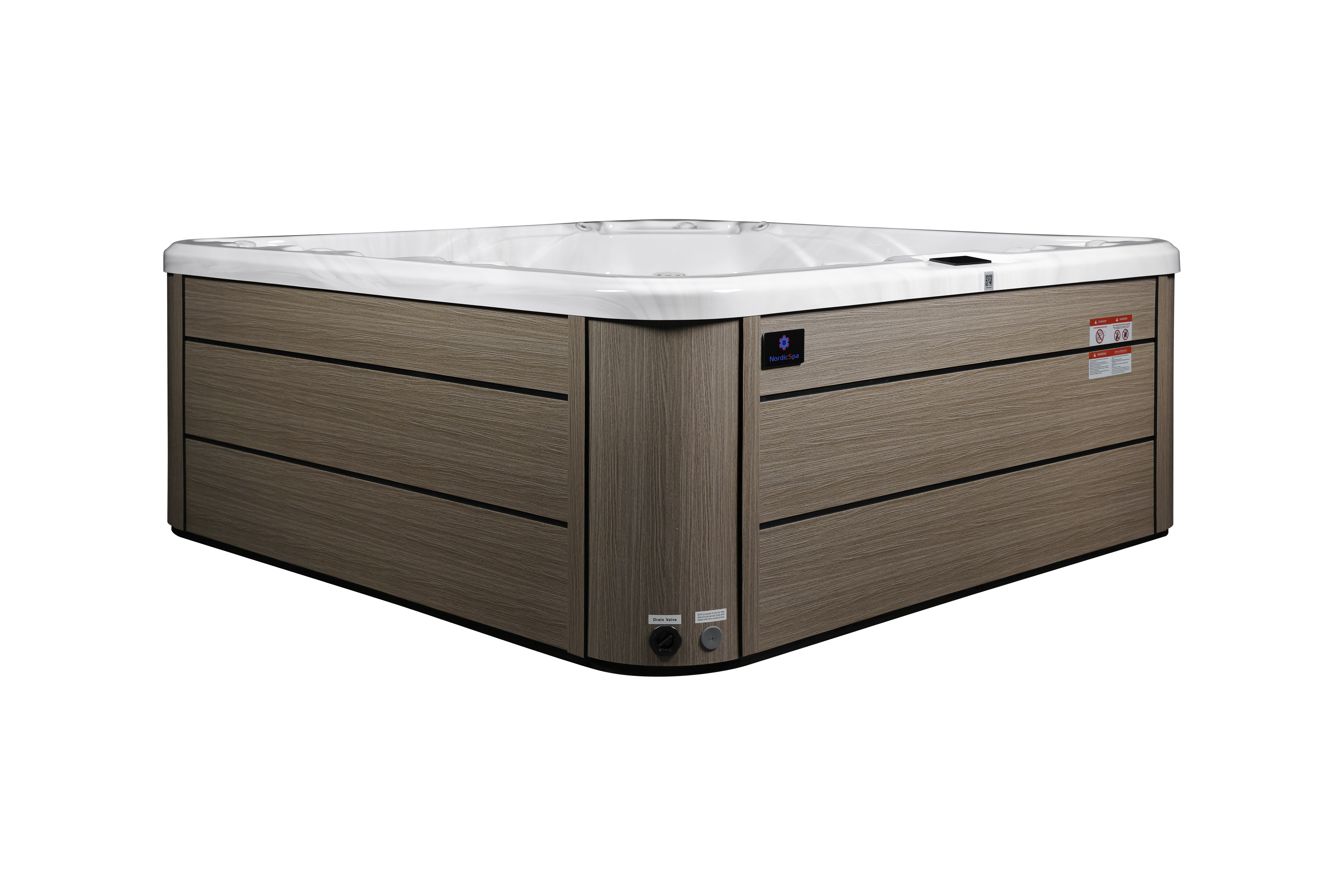 NordicSpa Khed с размером чаши 2,3 x 2,3 м идеально подходит для установки как в помещении, так и на улице. Просторная чаша с четырьмя эргономичными подголовниками комфортно вмещает до пяти человек, создавая условия для полноценного отдыха и общения.